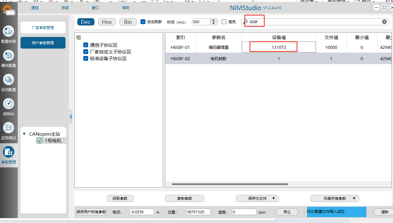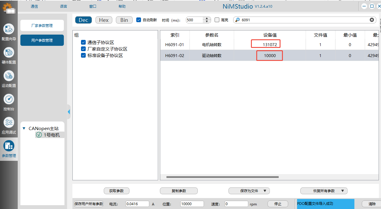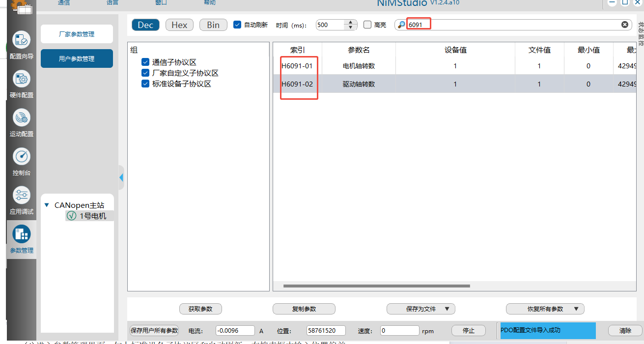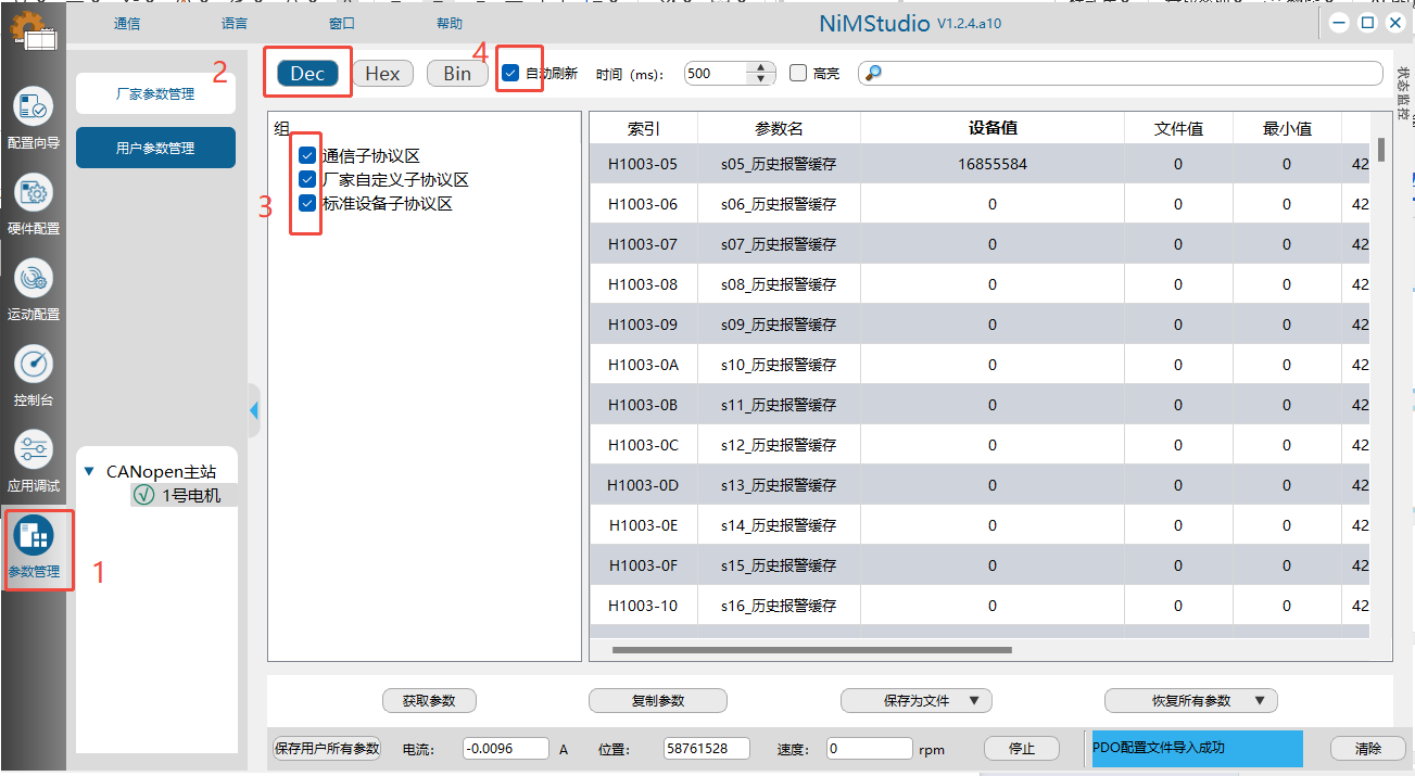 (2)选中1号电机,进入参数管理界面,选中Dec,让设备值10进制显示,然后勾上通信子协议区,厂家自定义子协议区,标准设备子协议区,最后勾上自动刷新。