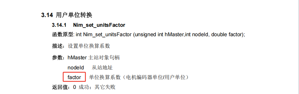 (6)使用我司SDK时需要注意,如果电机一圈脉冲数是10000,Nim_set_unitsFactor函数中factor也给了10000,那么后续调用Nim_moveAbsolute等函数时,目标位置给1,就表示电机转1圈,相应的使用Nim_set_profileVelocity等函数时,轮廓速度fVelocity参数给1,表示电机每秒转1圈。